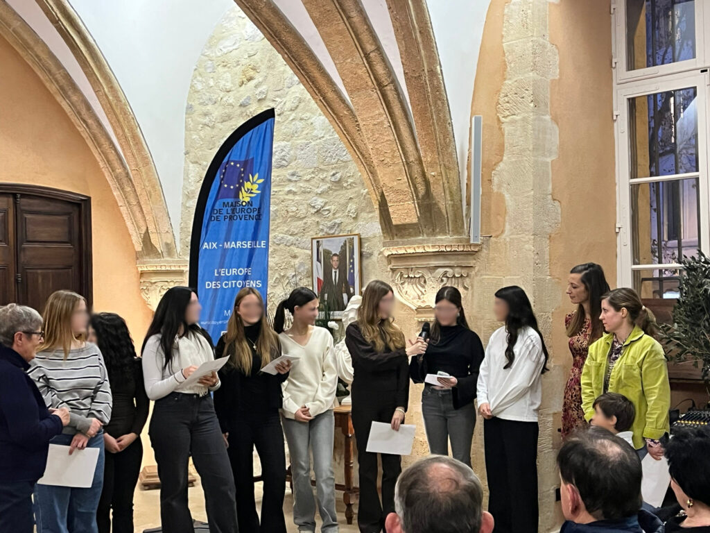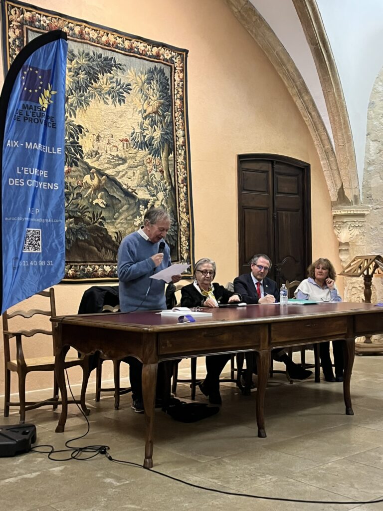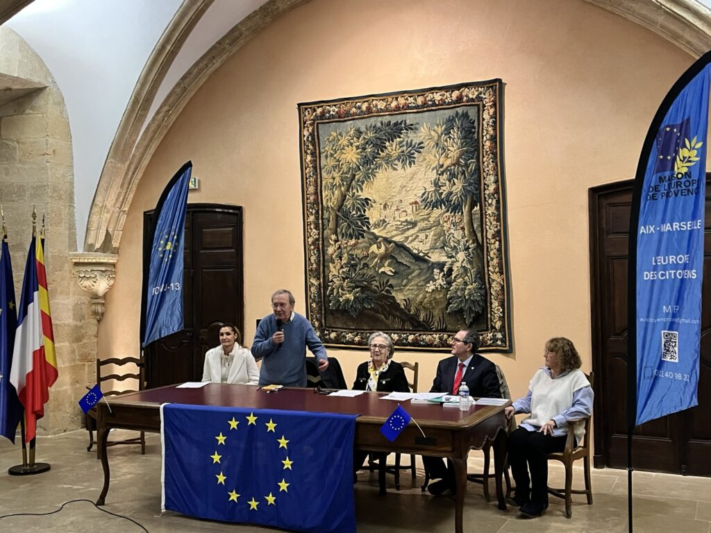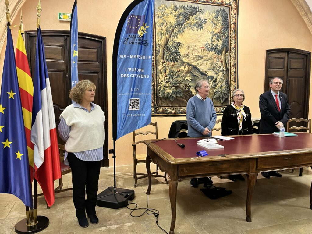 Chantal Bertin, vice-présidente de la MEP et présidente de la Fédération Départementale des Villes Jumelées des Bouches-du-Rhône, accompagnée de Brigitte Robin, a présenté ces jeunes ambassadrices de l’Europe. Chacune a pris la parole dans une langue européenne différente, laissant le public à la fois admiratif et un peu circonspect… avant de reprendre leur message en français, dans un bel effort de compréhension mutuelle. La surprise finale fut particulièrement émouvante : les jeunes ont interprété La Coupo Santo (l’hymne provençal), chant emblématique du Félibrige, écrit en 1867 en l’honneur d’une coupe en argent offerte par des Catalans aux Félibres provençaux. Un moment suspendu, salué par une longue ovation.