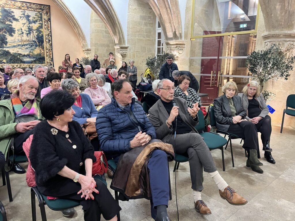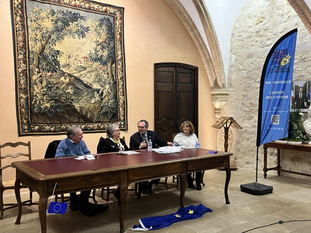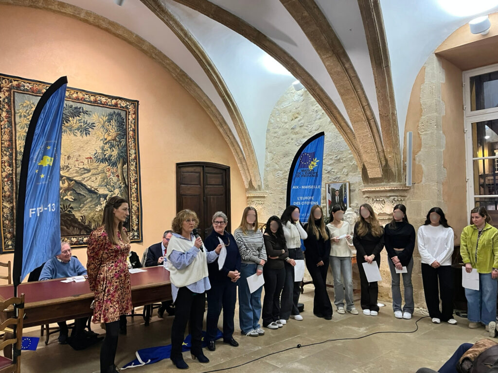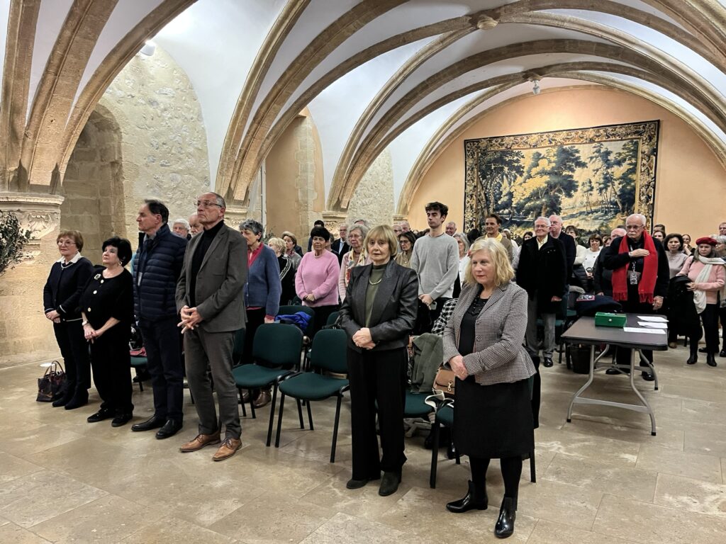 Chantal Bertin, vice-présidente de la MEP et présidente de la Fédération Départementale des Villes Jumelées des Bouches-du-Rhône, accompagnée de Brigitte Robin, a présenté ces jeunes ambassadrices de l’Europe. Chacune a pris la parole dans une langue européenne différente, laissant le public à la fois admiratif et un peu circonspect… avant de reprendre leur message en français, dans un bel effort de compréhension mutuelle. La surprise finale fut particulièrement émouvante : les jeunes ont interprété La Coupo Santo (l’hymne provençal), chant emblématique du Félibrige, écrit en 1867 en l’honneur d’une coupe en argent offerte par des Catalans aux Félibres provençaux. Un moment suspendu, salué par une longue ovation.